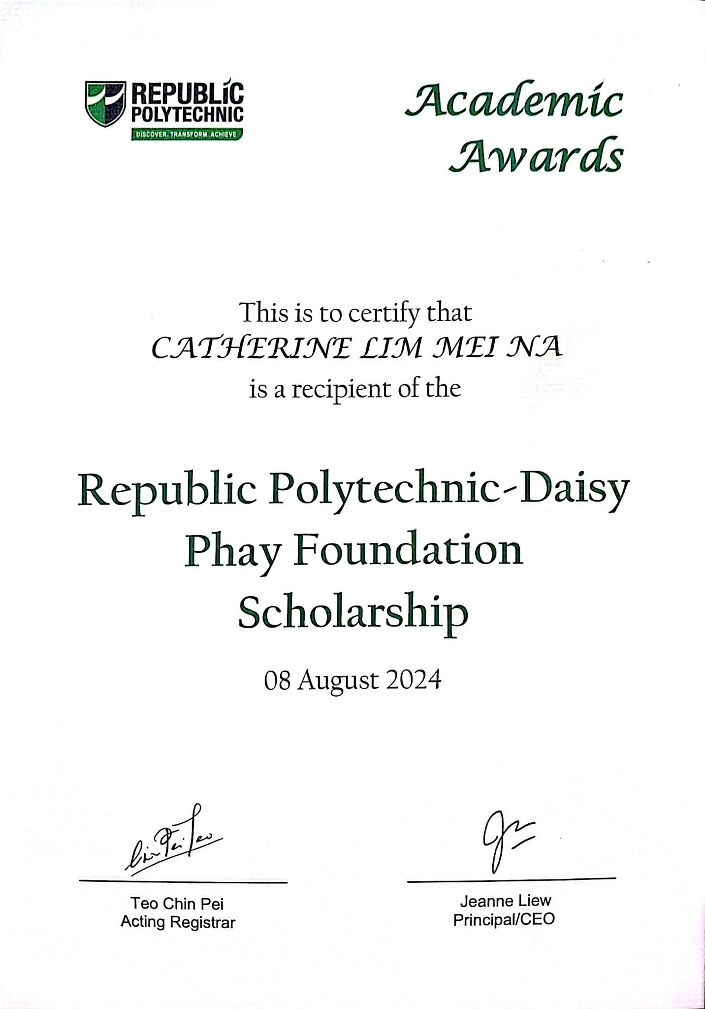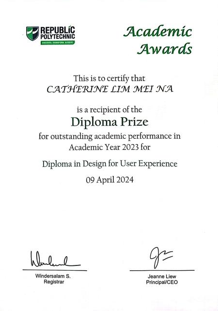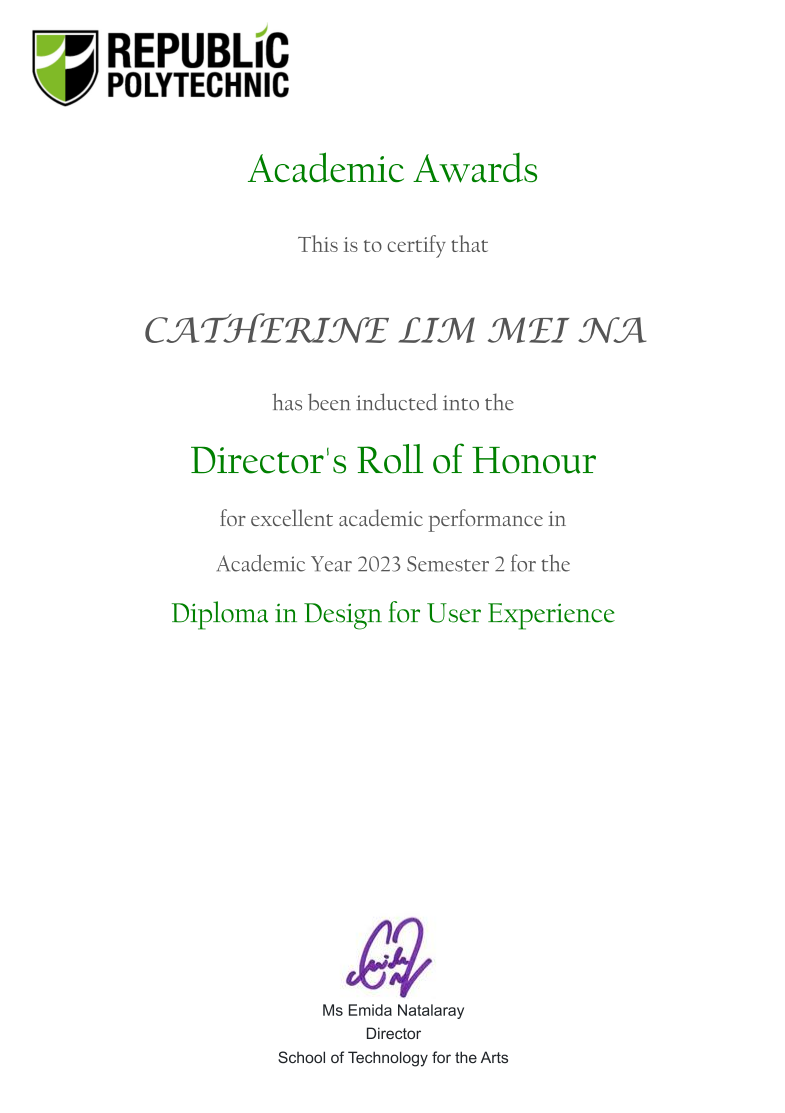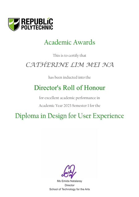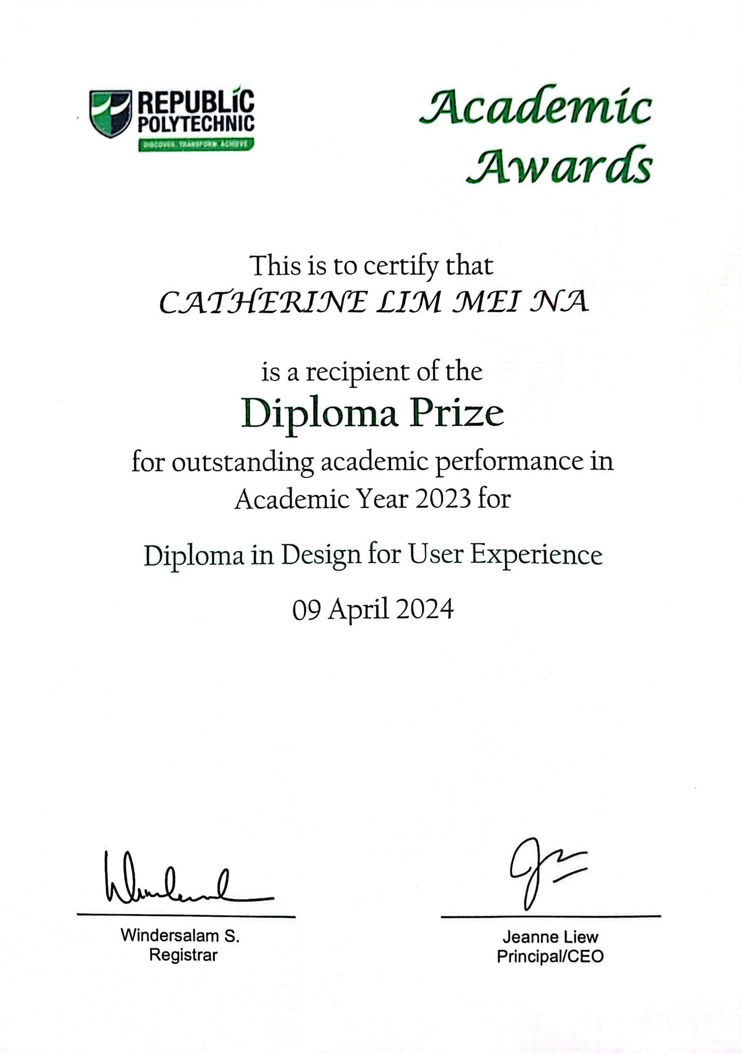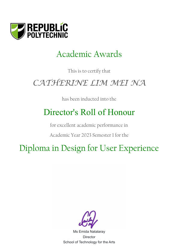 I am graduating from Republic Polytechnic under Diploma for Design in User Experience with a Minor in Digitalisation with a GPA of 3.77